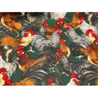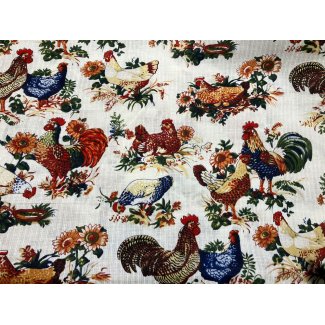 This fabric is comprised of large colorful chickens on a polished cotton fabric.
