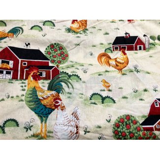 This country them fabric by Cranston Village, features chickens and roosters out in the field with pumpkins and sunflowers. This fabric is out of print.