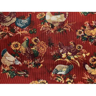 Hens and Roosters on Barn Red.. Fabric measures 1 yard in length by 445/45 inches wide.