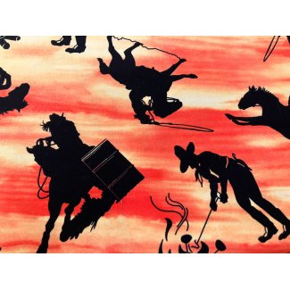 This stunning fabric depicts cowboys riding their horses at sunset, The colors are bright and vivid, Fabric measures 1 yard in length by 44/45 inches wide.