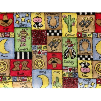 This cotton country fabric is all about cowboys essentials. The nice quality fabric by Shamash & Sons, features gloves, saddles, spurs, cowboy hats, and boots.