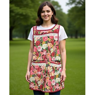 This gorgeous rose cobbler apron is simply unique and too pretty to pass up. For the front, we chose a gorgeous pink, yellow, and purple floral print. The reverse side of the apron was made using a small rose print. The straps were made using a different floral rose print, which really adds character to this lovely apron. What sets this apron apart from the other aprons, is the white eyelet trim that was added to the top of the pocket. This is a one-of-a-kind apron.
