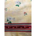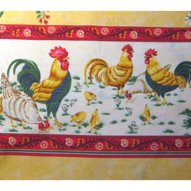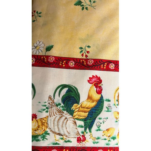 Amy Apron Rooster Border-Cotton Fabric-. 1 Yd. Darling Amy Apron Rooster Border Fabric. Perfect for making curtains, aprons, table cloths, and more. This is a lightweight fabric. Fabric design runs parallel to salvage edge. The other border. is the stripe design, as shown in the second image.