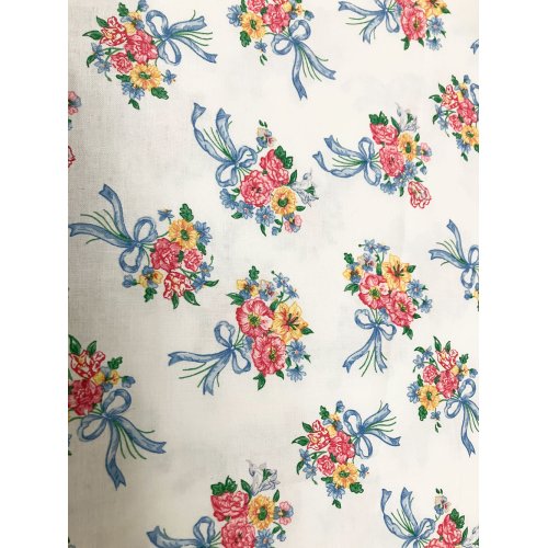 This floral bouquet on white background, is a heavier cotton weight fabric. The fabric measures 1 yard in length by 44/45 inches wide.