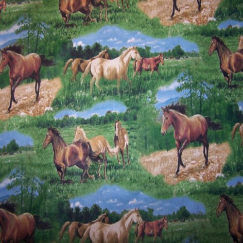 These horses are enjoying running in the fields and rivers. Fabric measures 1 yard in length by 44/45 inches wide.