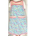 This colorful moon pie crossback apron, is perfect for the baker in your life. We used polka dot print for the bodice and pocket accents, The; polka dot print and the bright pink pink bias tape, compliment the colors in the moon pie print fabric. This is currently made up in large..