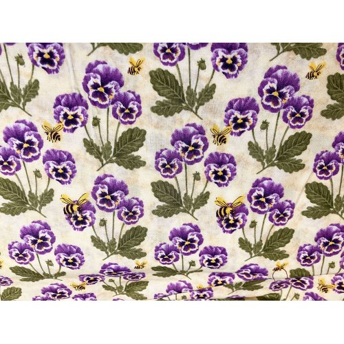 Purple Pansies with bees by Debbie Mumm. Fabric measures 1 yard by 44/45 inches wide.