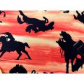 This stunning fabric depicts cowboys riding their horses at sunset, The colors are bright and vivid, Fabric measures 1 yard in length by 44/45 inches wide.