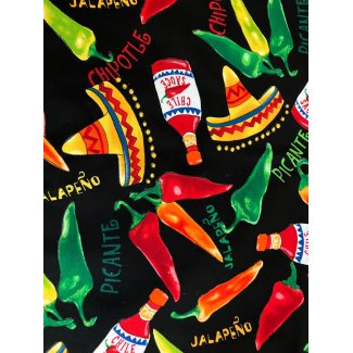 Peppers, Hot Sauce, Sombrero by Timeless Treasures. Fabric measures 1 yard in length by 58 inches wide.